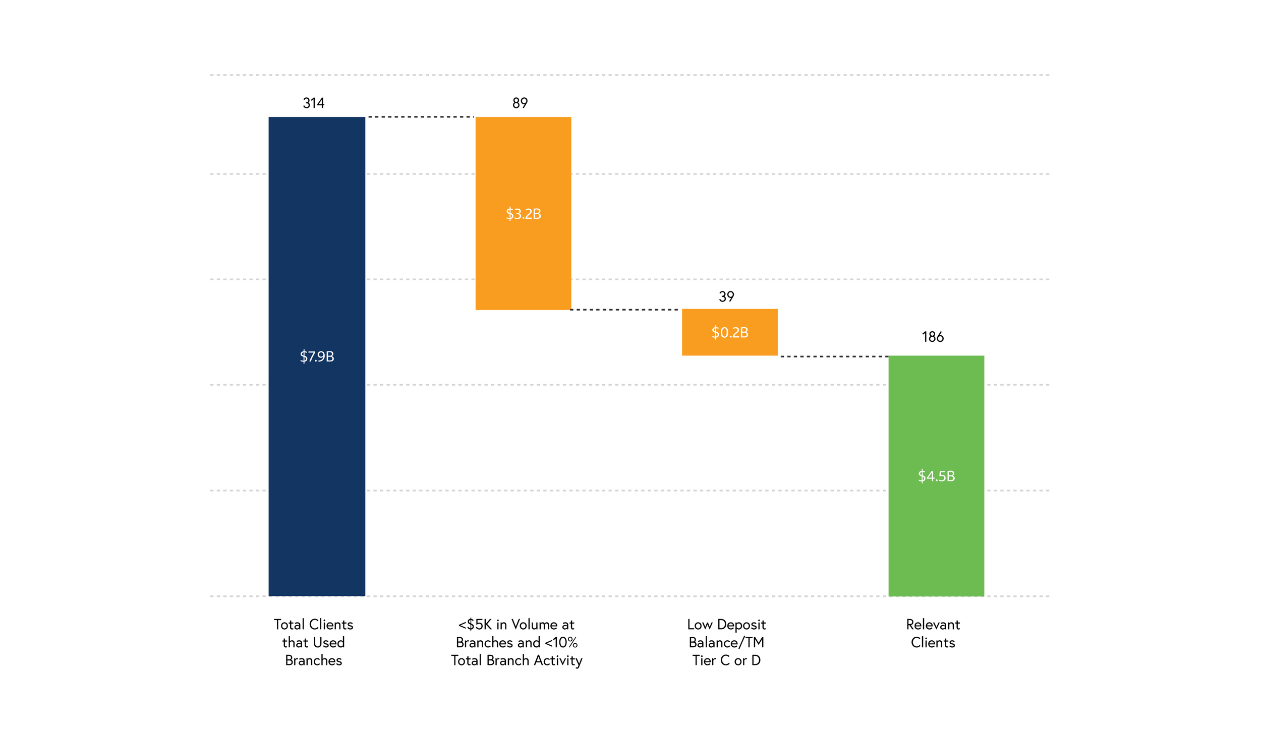 The Marketing & Analytics team analyzed over 30,000 branch transactions, including check handling and cash activity, across 300+ clients. Low-relevance data was filtered out by excluding clients with transactions under $5K or minimal branch reliance. The remaining clients were segmented by product coverage: unmet needs, fully met needs, and partial coverage. This segmentation provided an initial view of potential risk tied to gaps in branchless solutions.