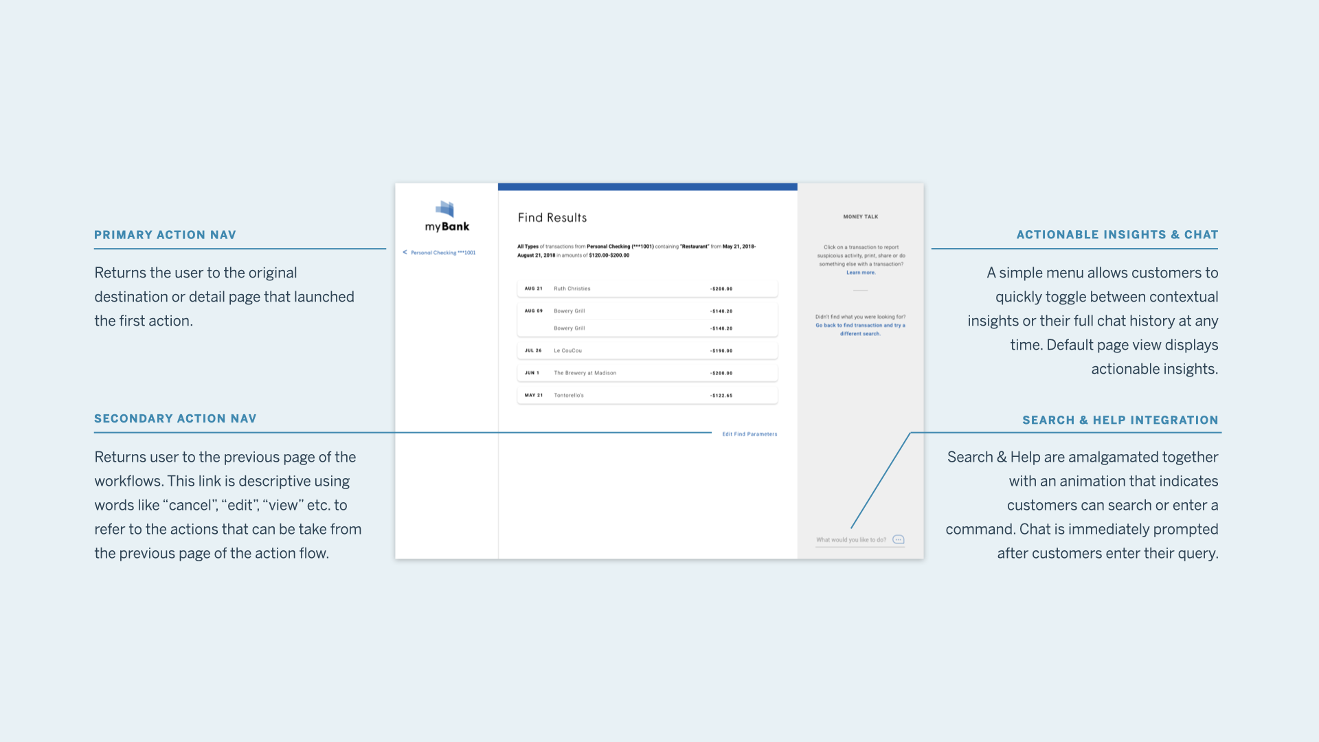 To reduce complexity, the platform is structured around a simplified two-layer architecture consisting of destination pages for main sections and detail pages for deeper interactions. Workflows are designed as modular elements that can be triggered from multiple entry points, rather than being tied to a fixed structure. Each page includes navigation, core content, and MoneyTalk - a contextual chatbot that adapts dynamically to the user’s actions, offering guidance, surfacing insights, and supporting task completion in real time.