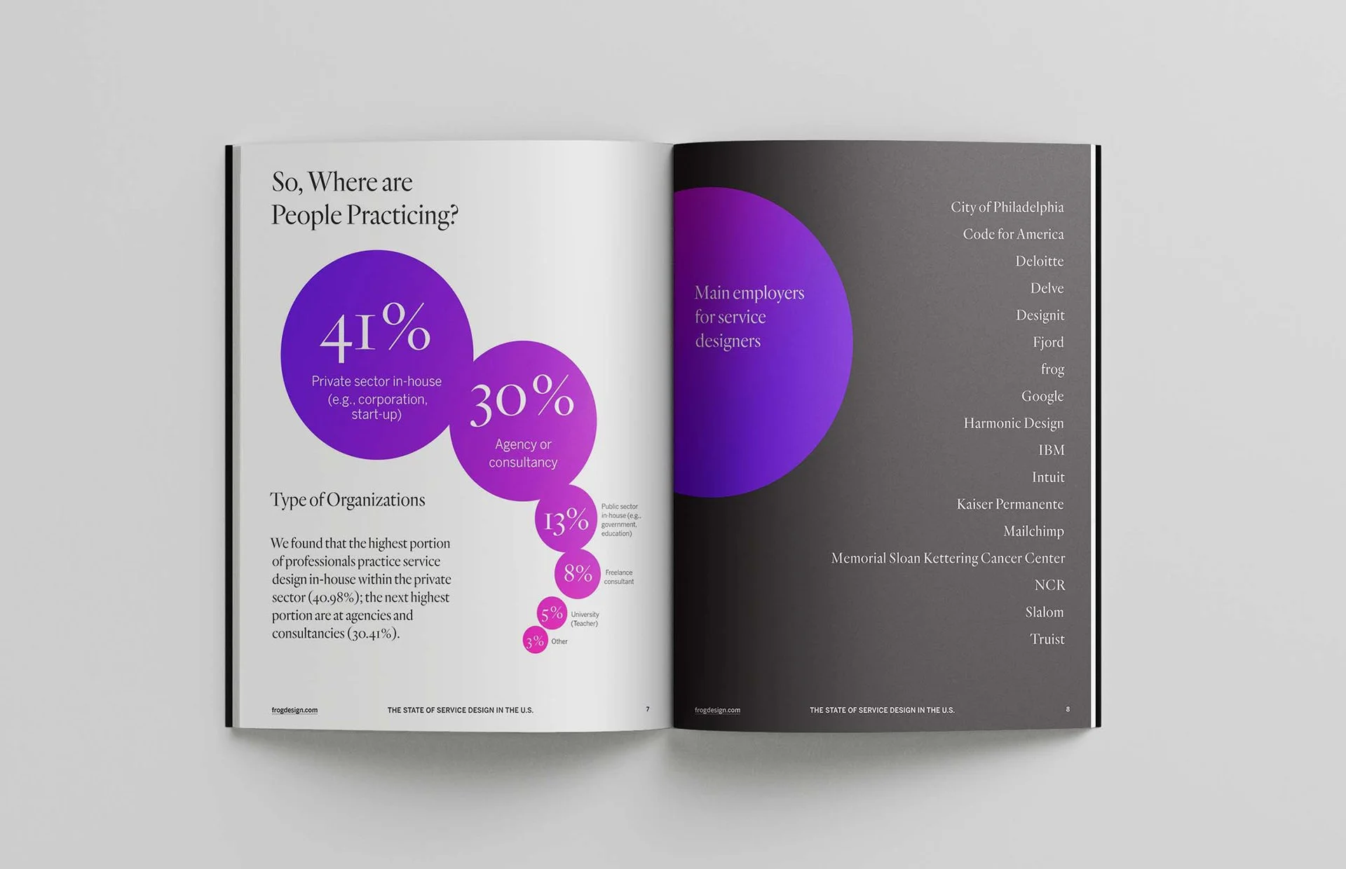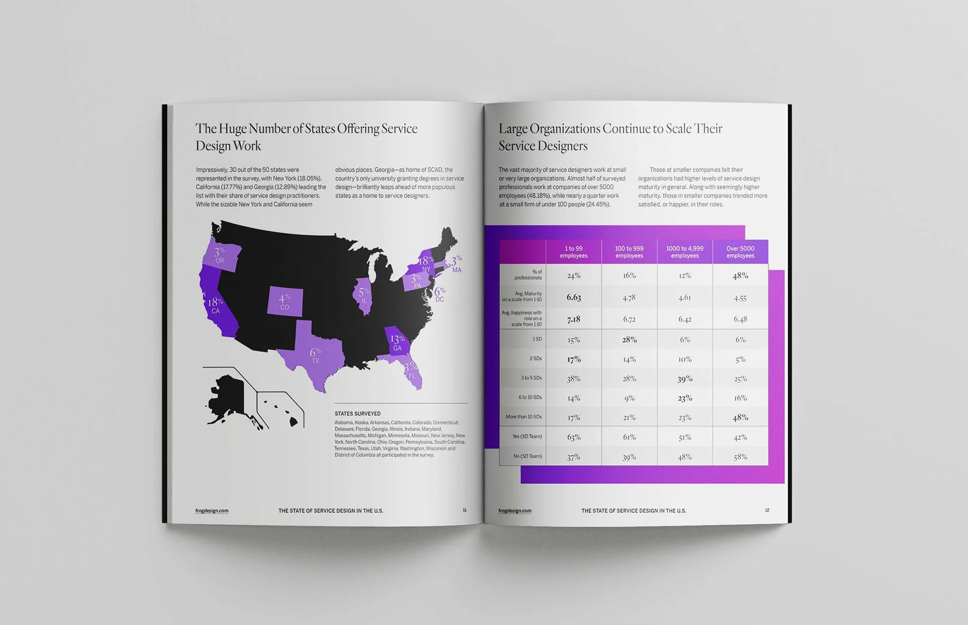 With services making up about two-thirds of the US economy, this report illustrates the current state of Service Design analyzing practitioners’ background, role and skillset alongside their organizations’ sector, team size, maturity and implementational challenges. The study was born from a collaborative research effort between frog, Service Design Network and the Savannah College of Art and Design. The data was captured through an online survey with over 350 responders across 44 states, and 10 interviews with thought leaders from different sectors.